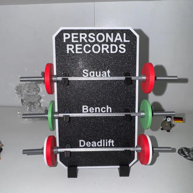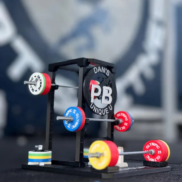 This miniature squat rack is the perfect way to track your personal records and show friends and family what you're made of. The weight plates on the barbells represent your personal record (PR) – the maximum weight you've lifted for the specific exercise.